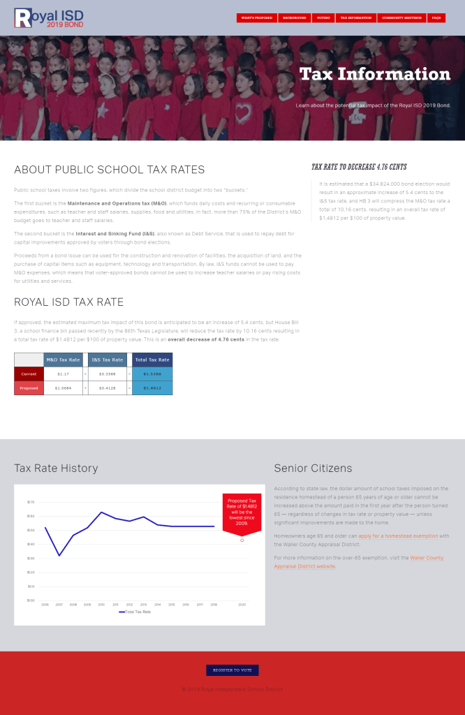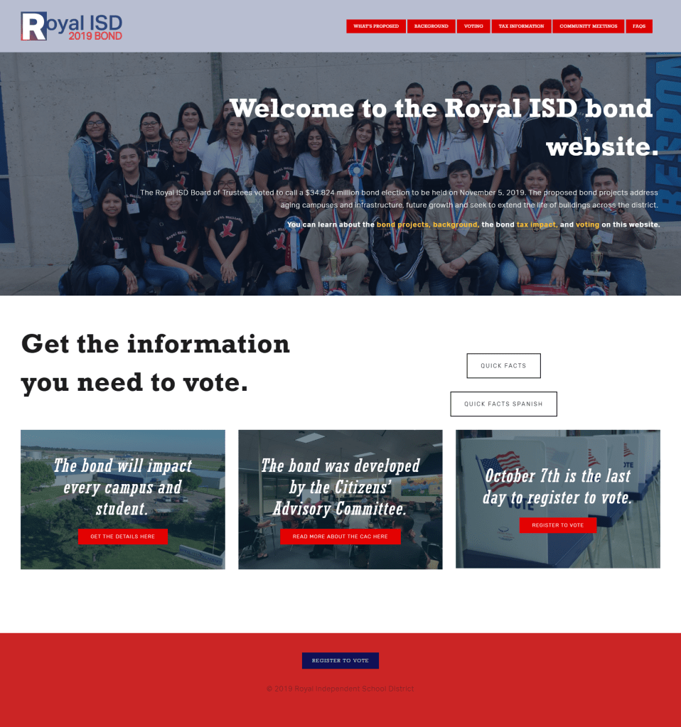 The Need: Royal ISD and Huckabee Architects partnered for a bond proposal to upgrade, renovate and replace facilities across the district and a bond campaign was needed to fund the proposal. This bond was a special challenge as the district called their votes only a few weeks before the election.