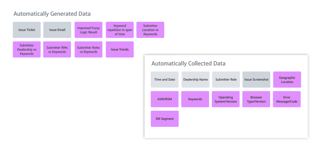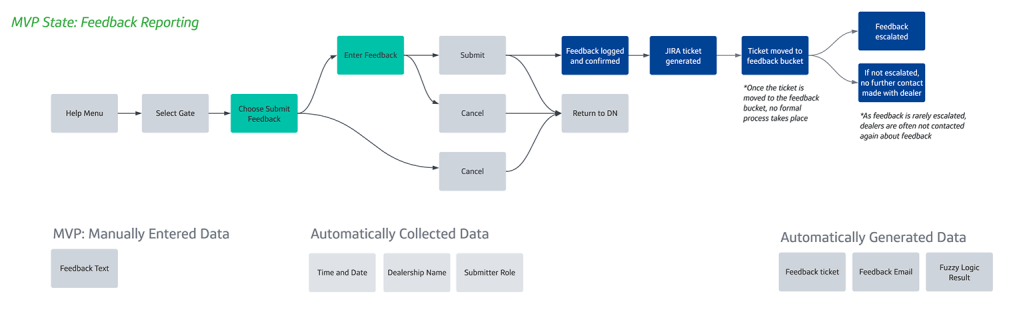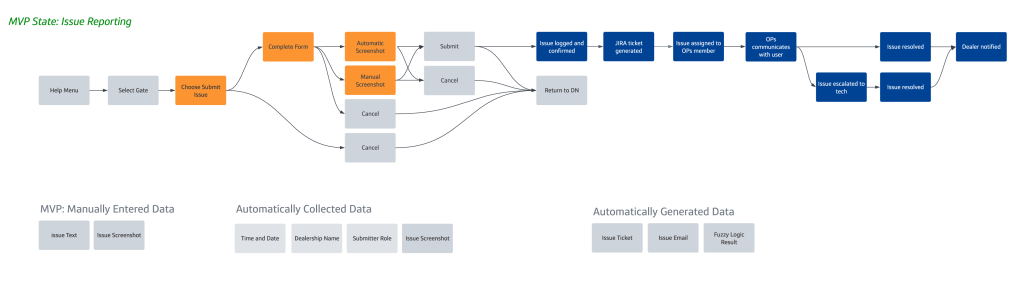 The MVP state of issue reporting gathers and sorts data while communicating with the dealer user through the process.